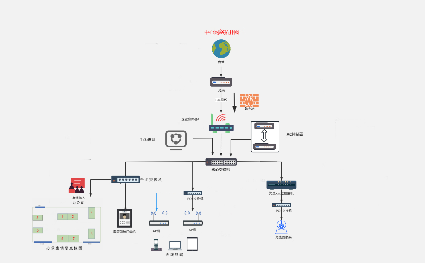 接入層:連接終端設(shè)備(PC、攝像頭、服務(wù)器),采用千兆/2.5G交換機(jī)。